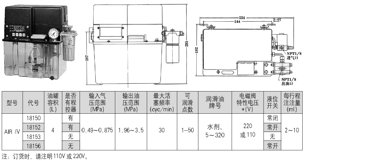 AIR VI型氣動潤滑泵是一種由壓縮空氣驅動的活塞泵,可適用於單線阻尼系統(SLR)和容積式潤滑系統(PDI)。注油壓力油壓縮氣體的壓力而定,注油量由活塞的行程及注油頻率決定,通過流量分配器可將潤滑油分配到各個潤滑點,配裝的SM系列程式控制器或使用者設備上的程式控制系統可對注油週期進行調節。